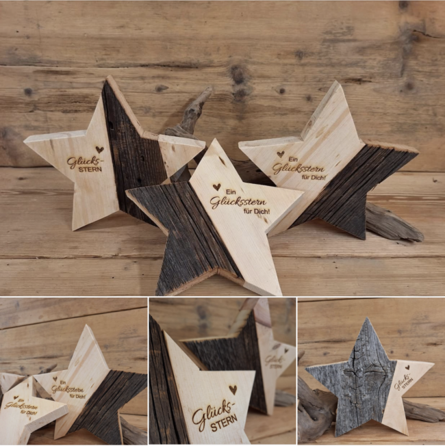 Bei uns wird kein Rohstoff verschwendet so entstanden auch unsere Altholzzterne die beim sägen auseinander gebrochen sind und mit Zirbenholz „repariert“ wurden
