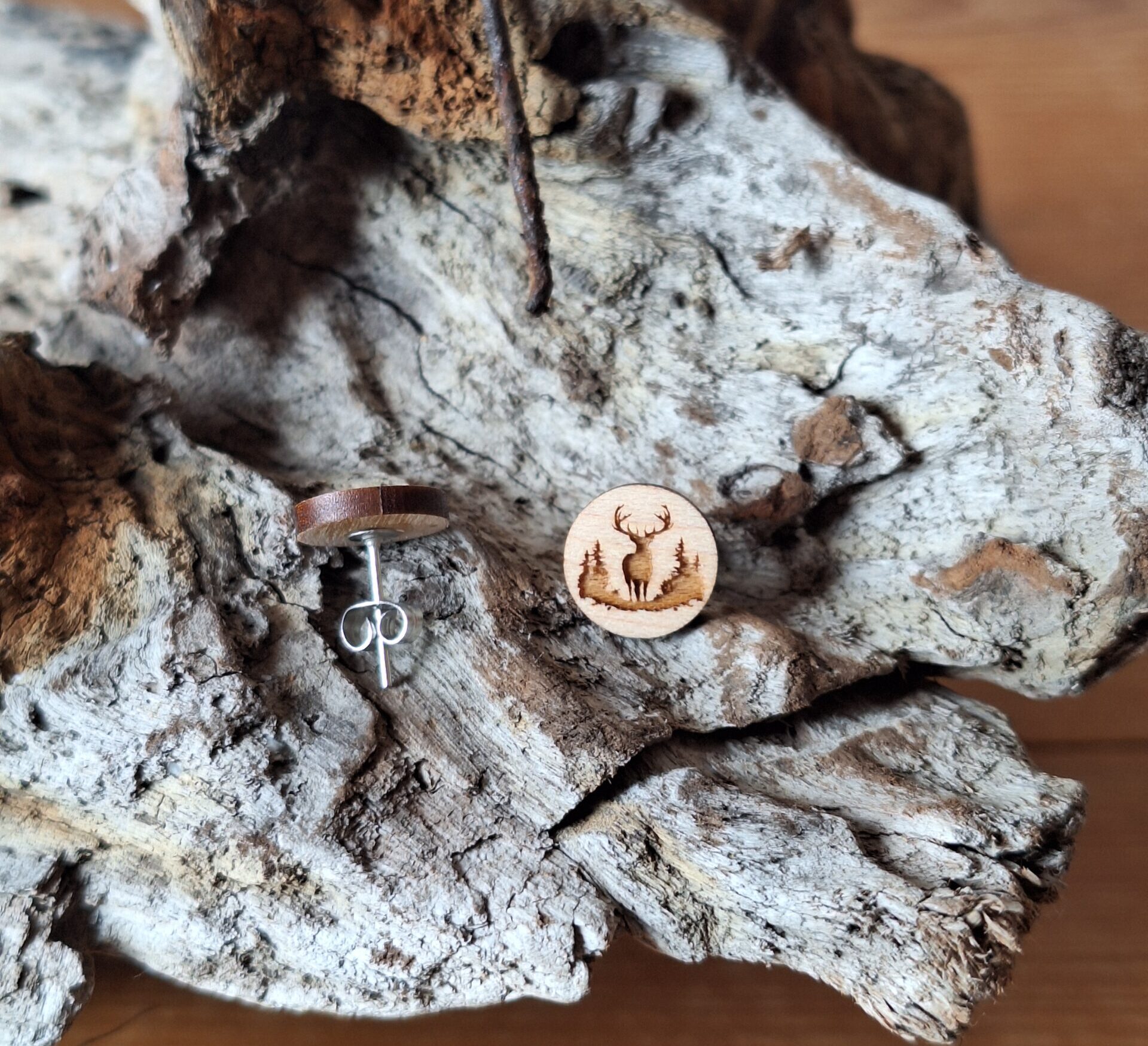 Diese tollen Hirsch-Ohrstecker aus edlem Ahornholz ergänzen perfekt jedes Trachtenoutfit oder runden den Alltagslook eines jeden Natur und Tierliebhaber ab. Die Ohrstecker mit einem Durchmesser von 1cm werden bei uns am PC Entworfen, gelasert und anschließend per Hand zusammengesetzt und geölt.