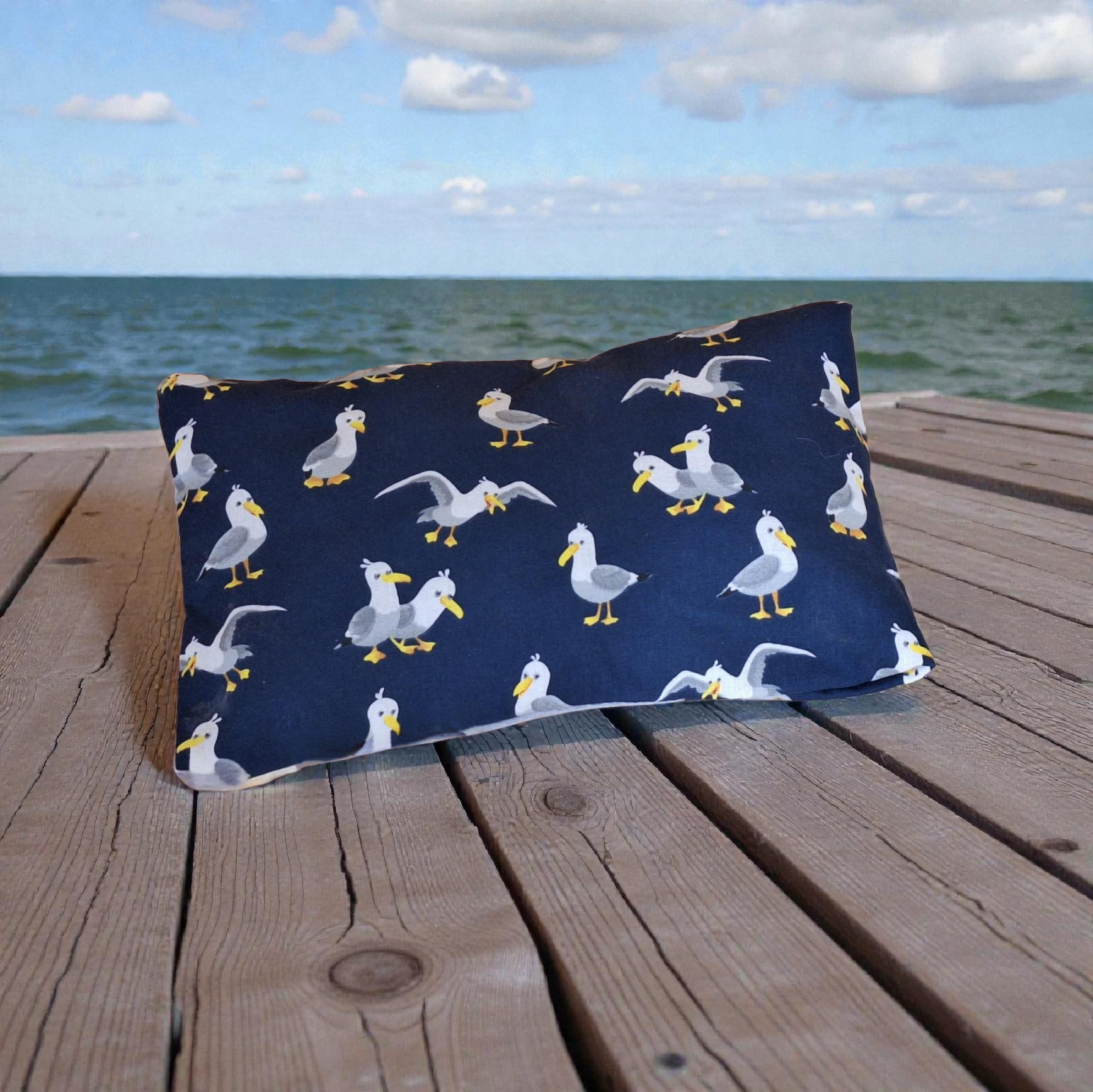 Das Kissen im Format 20×30 cm wurde vorne mit Motivstoff und hinten mit einem Waffelstoff handgenäht.